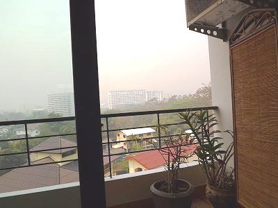 本来なら西の窓から正面にドイ・ステーブのお寺も見えるのだろうと思うのだが、このところの煙害でぼんやりと霞んでしか見えないのは残念だ。