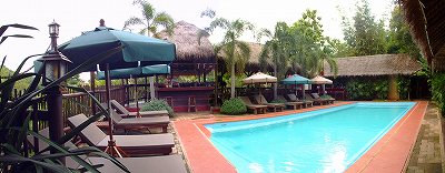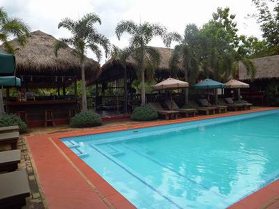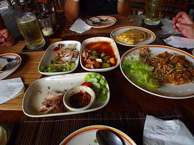 シャワー後アルパインゴルフ場近くにあるレストラン(バーンポーン)へ2人につれて行ってもらうが、ゴルフ場から15分位とそんなに近くは無いけれど、ファラン(西洋人)が経営していて、ホテルもレストランも茅葺風な建物で、のんびりゆっくりと食事が出来るのも嬉しい。