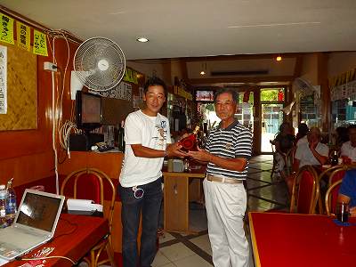 気分良く12時には終了して、シャワー後そのまま居酒屋(ぐでんぐでん2)へ集合 13時半過ぎには一名体調不良で欠席したが、他は全員参加して、サラダとカレーでの昼食後、表彰式が行われ、自分はラッキー7 S田さんから3つももらったとのことで(ドラコン距離は飛んだがラフだった)賞品1個頂いてしまう。