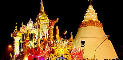 タイでは、毎年陰暦12月(新暦10月〜11月頃)の満月の夜、川の恵みへの感謝の気持ちを表し、自らに宿る穢れを濯ぐため、ロウソク、線香、花などで美しく飾られたたくさんのクラトン(灯篭)を川に流す「ロイクラトン」と呼ばれるお祭りが全国各地で行われます。 チェンマイのロイクラトン祭りは「イーペン」と呼ばれ、ピン川を流れるクラトン(灯篭)が水上に浮かんだ天の川のように幻想的で美しいお祭りとして有名です。 また、お祭りのメインは美しい山車(フロート)のパレードで、美しく飾られたクラトンを模したフロートが街を優雅にゆく様は、チェンマイでしか見ることのできない光景です。