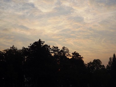 朝はうろこ雲だったが、次第に晴れ間が広がってくる、夕方の太陽が大きく美しい