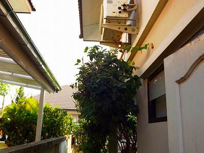 上の写真 ブーゲンビリア 隣の家に、クーラーにも勢いよく伸びているので枝落としをと思ったのだが、その前に理恵さんは街へ 用事と買い物へ DVDを見てから帰るのを待って・・・