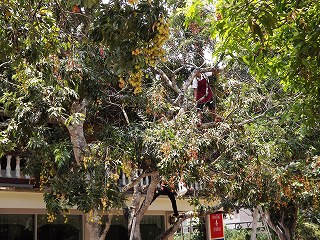 駐車場に車を入れると、その大木にたわわになっているリンチーの収穫をしている。