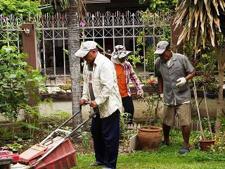 先に我が家の芝刈りを始めると、M川さん・T井さんが我が家に来てくれる。
