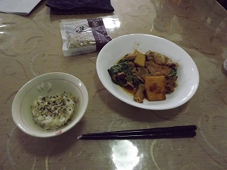 12時昼食 ご飯と豚肉・ソーセージ・庭からのレタスと春菊の煮物。