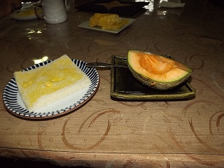6時半朝食 パンと庭で育てたメロンと頂き物のパイナップル