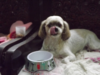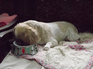散歩から帰り暫くして朝食勧めると寝そべり姿ではあるが食べた!