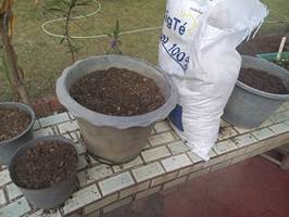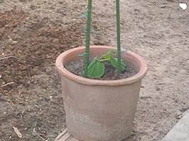 お昼休み後今日も一仕事 土肥料(牛糞)鉢に入れながら、ゴーヤ1個 鉢へ(まだ3個あるが・・・)