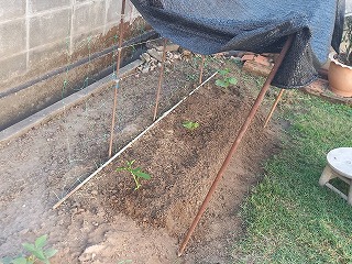 左苗がしおれている・・・ 遮光ネット張ってみる 左 新ゴーヤ植替え
