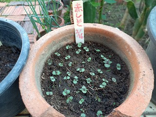 帰宅しベランダ休憩しながら、(たそがれ)リスを見て、赤紫蘇 間引きとぶつからないように植え替え