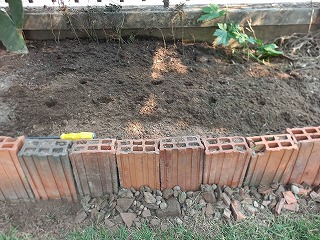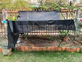 もらったクリップで日除けして、畑耕して最初の3本 オクラを路地植えしながら周りの雑草取り