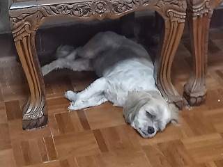 急に太陽の向きが変わり、西日の暑い光にばてる野菜・紫蘇も・・・ ルンも床に寝そべり暑さを・・・