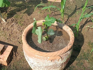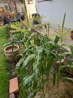 トウモロコシ 雌しべ一本だけだが出て来たので、こちらも受粉を行う ゴーヤも受粉するが門近くが3個!