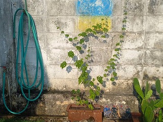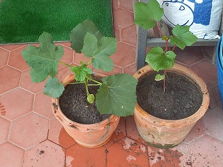 赤いオクラと普通のオクラ 1本づつ 午前太陽浴びるところに2本 ベランダは直接太陽浴びない2本