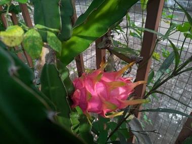 青空が見える中いつもの時間に散歩 途中で出会う92歳のおばあさんへドラゴンフルーツ2個差し上げる