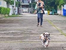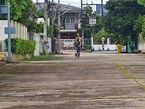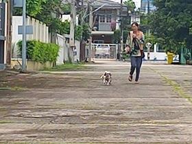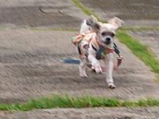 わが家への曲がり角で待つ 朝布団に潜り込んでいたので服を着せる 元気いっぱい!!!