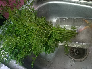 首輪しているので野良犬ではない ルンよりも小さいが嫌がっている? 葉っぱは立派だが人参があまりにも細いぞー