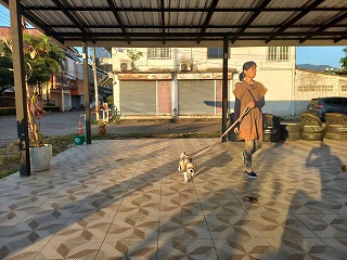 いつもの散歩へ 鼻で少し開いているドアーを開け表へ 訓練だなー