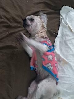 ルンちゃんは服を着て毛布に包まれて動こうともしない 散歩は行くつもりなんだが・・・