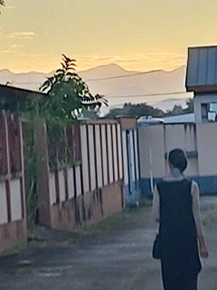いつもの散歩 山はきれいに見えて朝焼けも ちびもちも散歩か―・・・