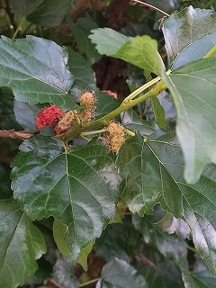 桑の実 今年2回目? 落ちているのを探すなー! スズメか? 細い枝にブランブラン・・・