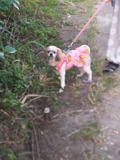 いつもの散歩 膝にサポーター 上はジャンパーで・・・ルンちゃんは歩き始めると元気良い!