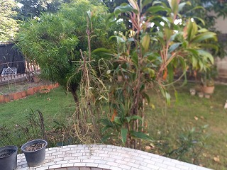 2本の木に寄生虫よろしく枝・蔓を這わせて2本の木の障害に・・・収穫終了時には撤去予定 来年はほかの方法で!