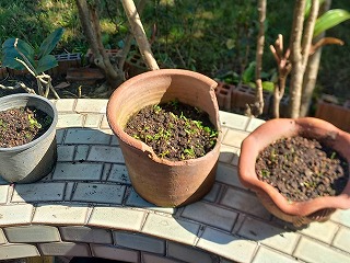 左から トアプー(四角豆) ナス 人参 やっと芽が出て来た! 11月19日に種蒔いたんだが・・・