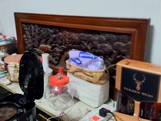 パンとヨーグルト 朝ドラ見ながら 突然彫り物の飾りが落下 紐が切れたんだろうがびっくりしたが被害なし!