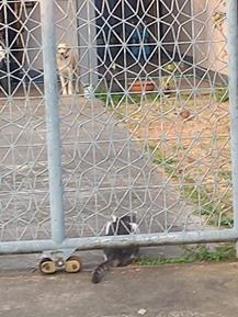 いつも通り7時には散歩へ 帰り猫が鳩を狙っていたんだが、ワンちゃんマニーに吠えられてお終い・・・