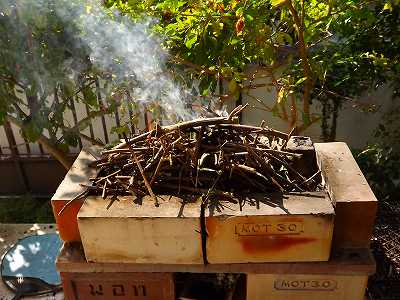ちょっと休憩してから、3本目のブーゲンビリア伐採に取り掛かり、そしてゴミ袋に詰めて、残りの木はバーベキュウ用に仕分けして作業を終えると16時になってしまった。