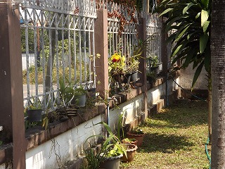 塀の壁には吊り下げようの花 |
