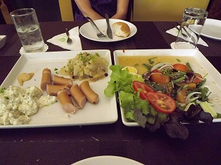 ソーセージとピザとタイ風ビーフサラダ 美味しいのだが、タイ風が青唐辛子が結構入っていて、辛かったなー(少しだけといったのに聞いてないのか?)