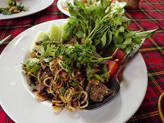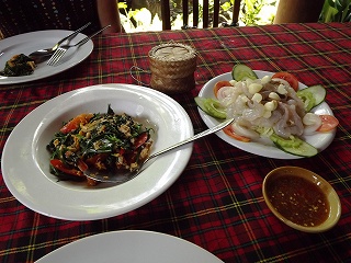 昼食 外へ行ってみようかと ランナーゴルフ場から一個目の信号左に入って、運河までの中間点にレストランあったのを思い出していくと、開店11時からになっているのに誰もいなく、扉も閉まっているので諦めて、チェンマイ国際会議場周辺を探すがこれといって見当たらなく、その1本南側の前に一度か二度行った事がある(ゲーンローンバーンスアン)へ。