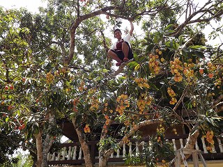 駐車場に車を入れると、その大木にたわわになっているリンチーの収穫をしている。