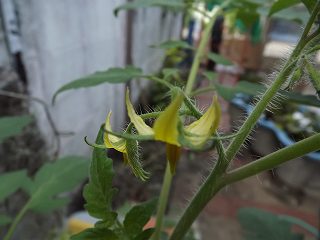 その後庭に出て、よく観察すると、トマト 2本目の花が咲いているではないか!