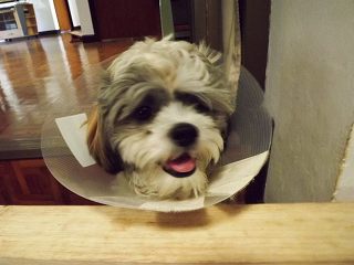 首には手術跡を噛まないようにとの首にラッパを取り付けられて痛々しい姿。