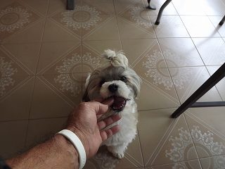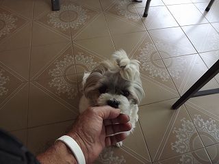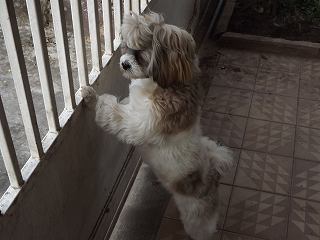 5時半起床 朝食後何時も通りルンが先に庭へ、その後を8時前にゴルフ練習しながら、ルンの見