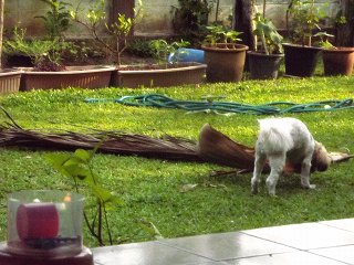 朝のルンが遊んでいた椰子の葉っぱは、残っていた砂を撒いて、そこへゴミ用に入れる。