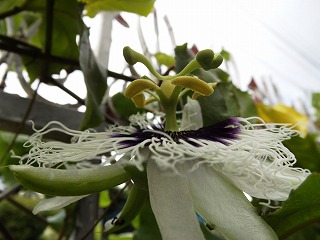 パッションフルーツ 花が2個咲いていたので、人工授粉する。