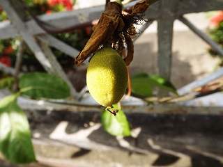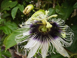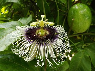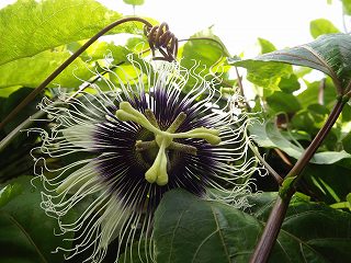 一休みしてから、パッションフルーツ 今日は4個咲いていて、1個だけめしべが4個のを発見。