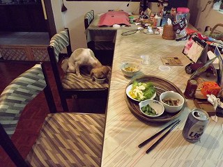18時少し前、作って置いてくれた夕食を、隣に座ってルンと一緒に食べる。