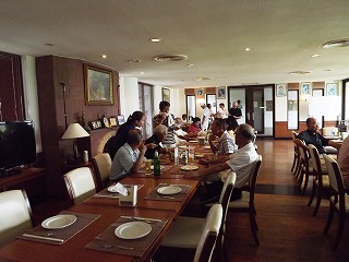 ベランダで庭を見ながら夕食前、今日のゴルフの反省