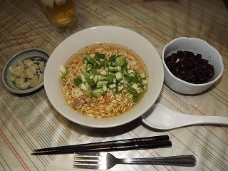 カップ麺に庭からの恵みものオクラをきざんで入れ、らっきょ・小豆とともに12時昼食。
