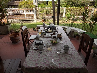庭を案内してから食事会 ガイヤーンはもちろんだが混ぜご飯、チーズケーキと・・・