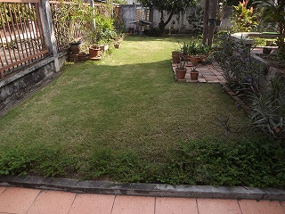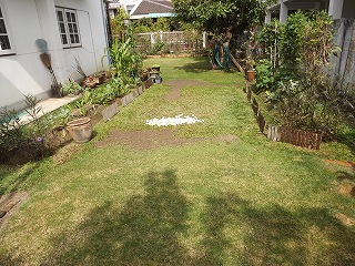 時々休みながら、芝刈りを終えて、芝の肥料=プイヤー 5袋入れてから芝生と野菜の水撒き!