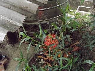 種蒔きしたところ(春菊・紫蘇・とうもろこし)の雑草取りしているとタンクの傍に{線香花火}