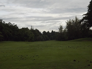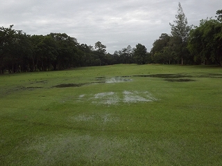 雲がどんより、フェアーウエーもところどころ水溜り 午後40分ほど雨