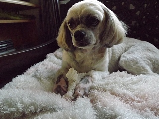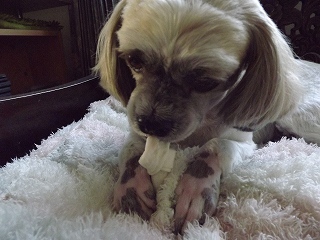 ルンも傍に来て骨付きドッグフードを苦労しながら、ソファーで食べている。