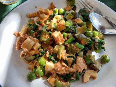 17時半夕食 かき揚げ丼風にして、タイのたれ辛いが美味しかった!